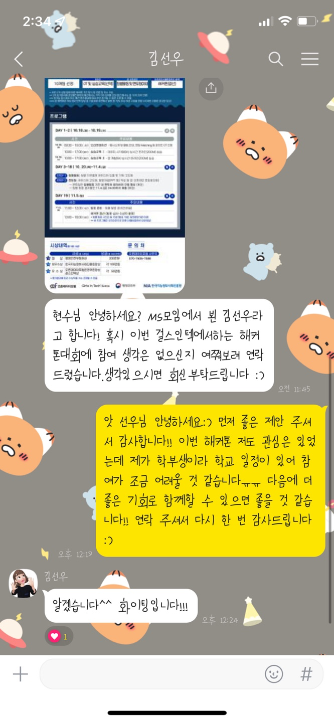 하나는 윤지가 그 lg girls ict ..? 아이디어톤 같이 나가자고 하는 제안이었고, 다른 하나는 걸스인텍 마이크로스프트 밋업에서 뵌 개발자분께서 같이 해커톤 나가자는 감사한 제안을 주셨는데..!! 내가 맡은 일에 좀 더 책임감 있게, 잘 해내고 싶어서 모두 아쉽지만 거절하게 되었다. 그치만 제안을 주신 두 분,, 정말 마음 깊이 감사하고 있습니다,, 다음에 더 좋은 기회로 꼭 다시 만나기를!!