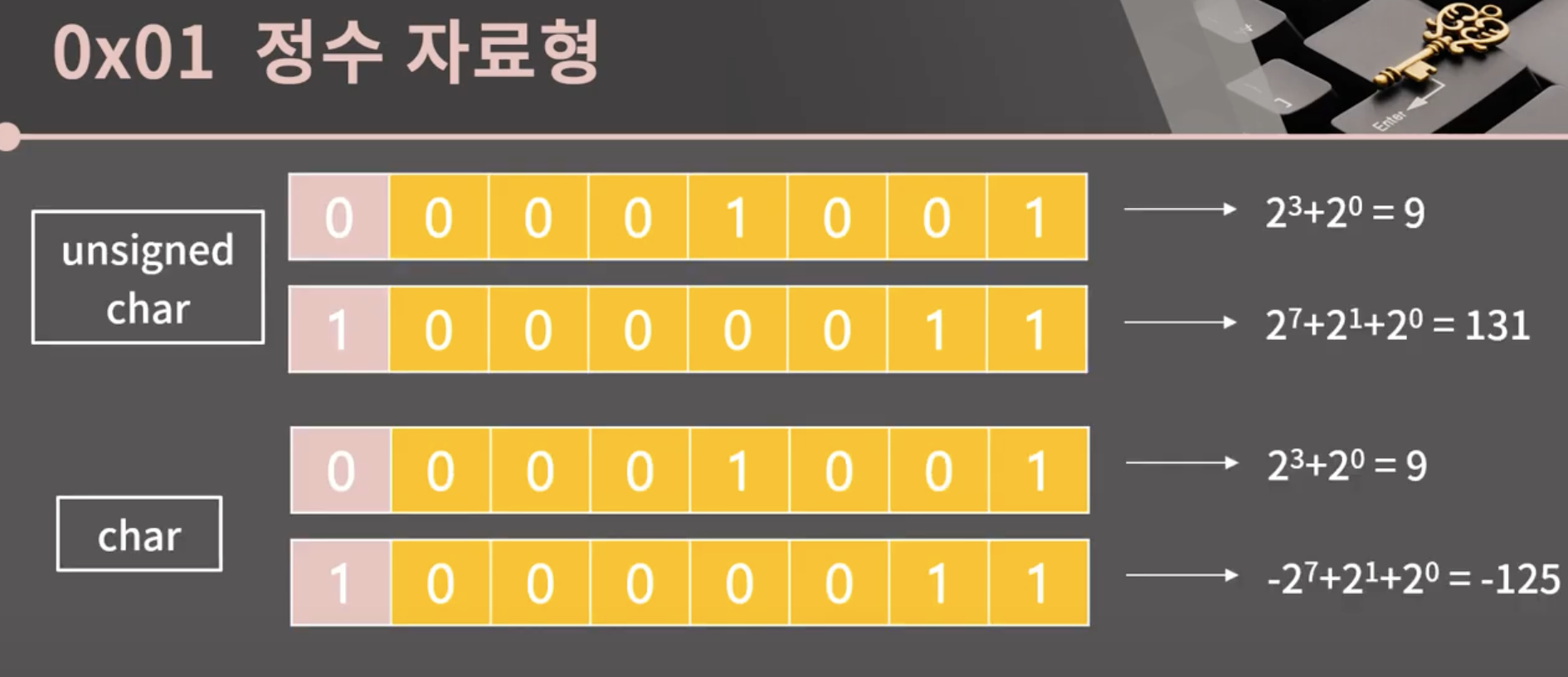 정수 자료형 (type) -> char 가 문자를 담는 자료형이라고알고 있었는데, 정수를 담는 자료형이라고 소개해서 혼란스러움..