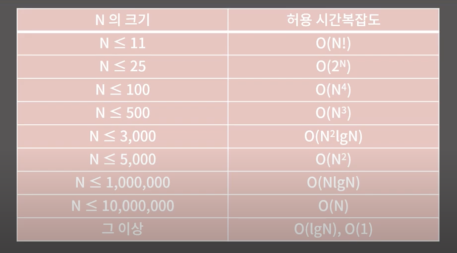 n 의 크기에 따른 허용 시간복잡도. 절대적인 것은 아니나, 이 정도 시간대로 처리하는 것이 유리하다는 느낌은 가지고 있어야 함.