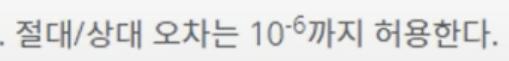 1e-12 가 의미하는 게 10^-12. 1e9 가 10^9. 문데에서 주어지는 절대/상대 오차의 차수에 맞추어, 두 수의 차가 그 이하이면 같다고 정의해야 함. 즉 == 대신 - 를 사용해서 비교해야 함.